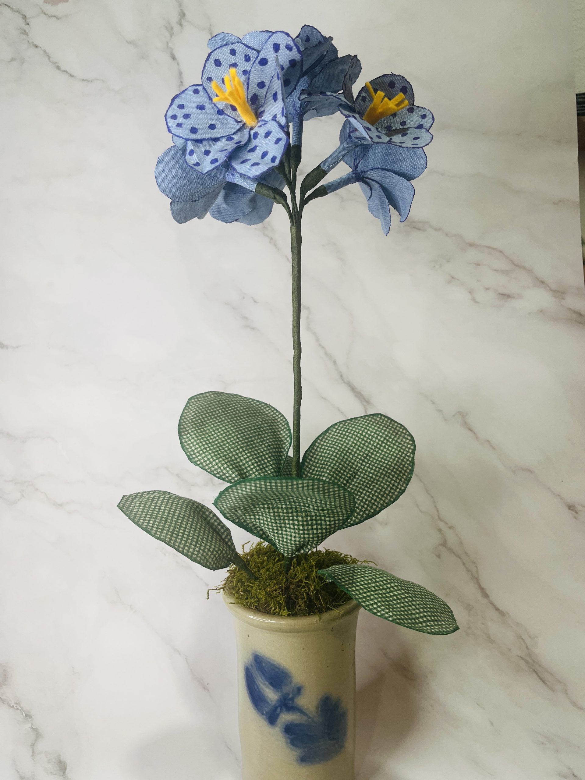 This is a charm and suitable blue with purple dots flower made of fabric measures 19″h x 4″l x 4″w approximately. Each flower mesures 2″x 2″.