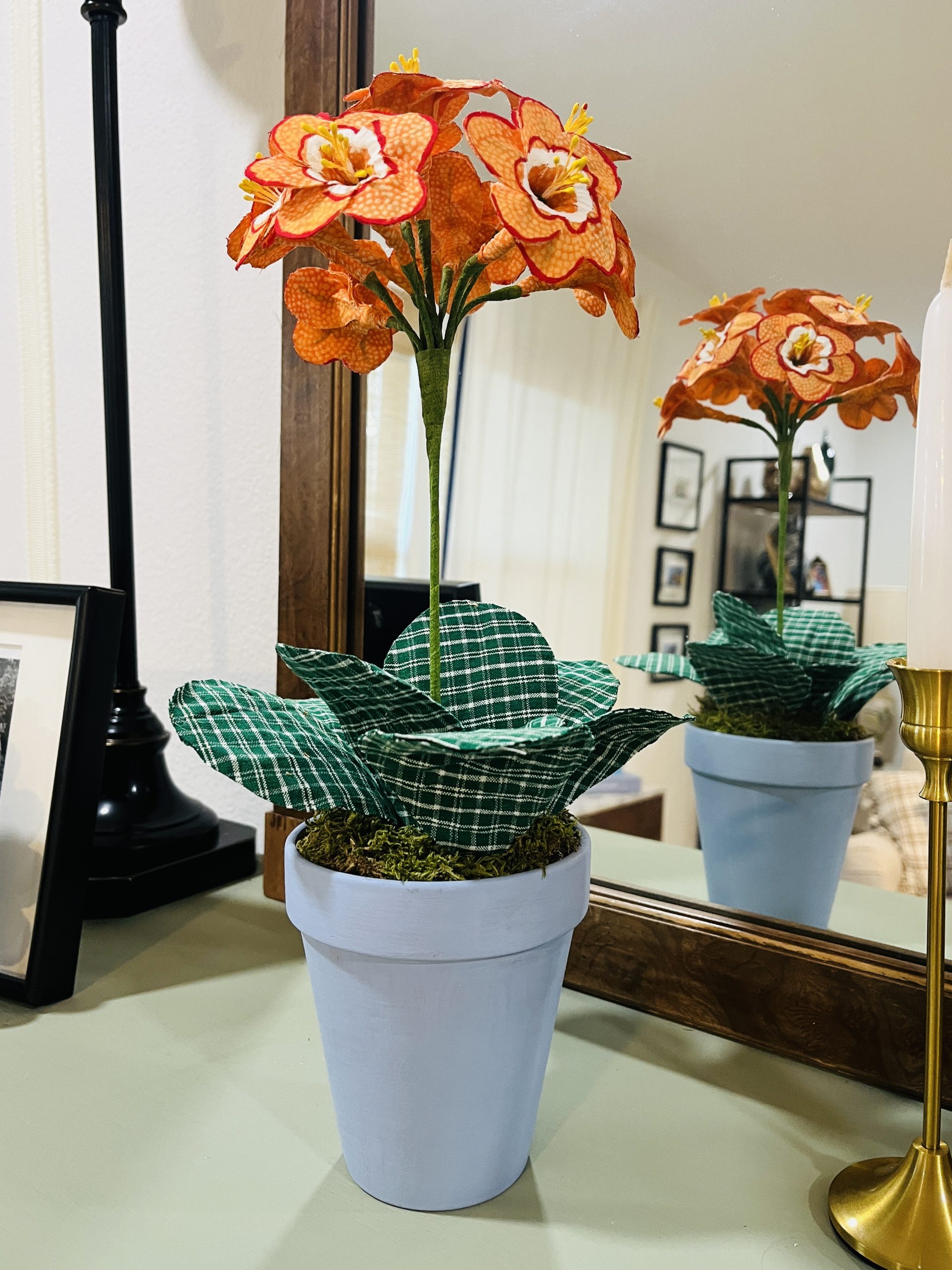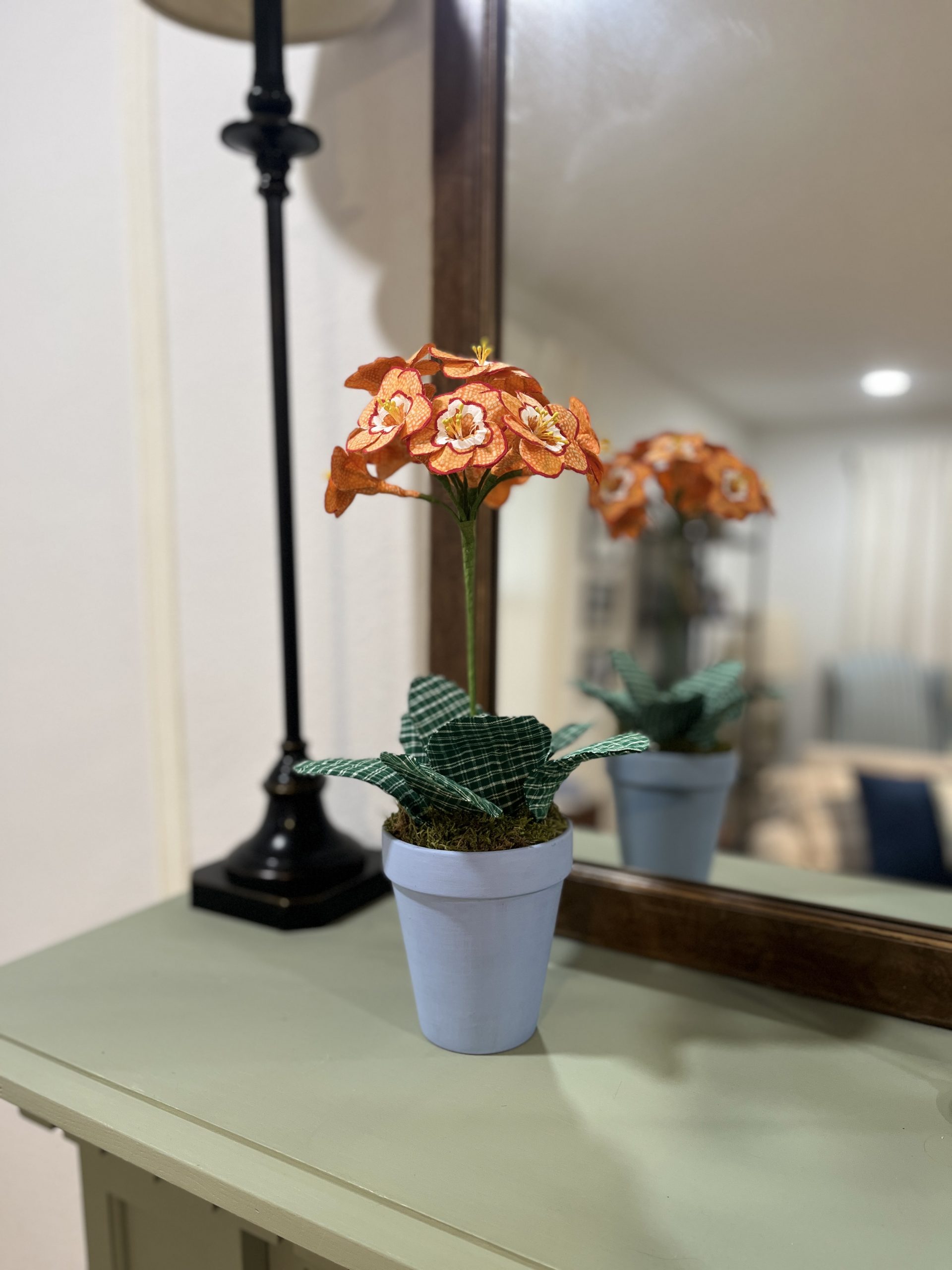 This one made on a bright orange fabric measures 14″h x 4″l x 4″w approximately. Each flower mesures 2″x 2″.