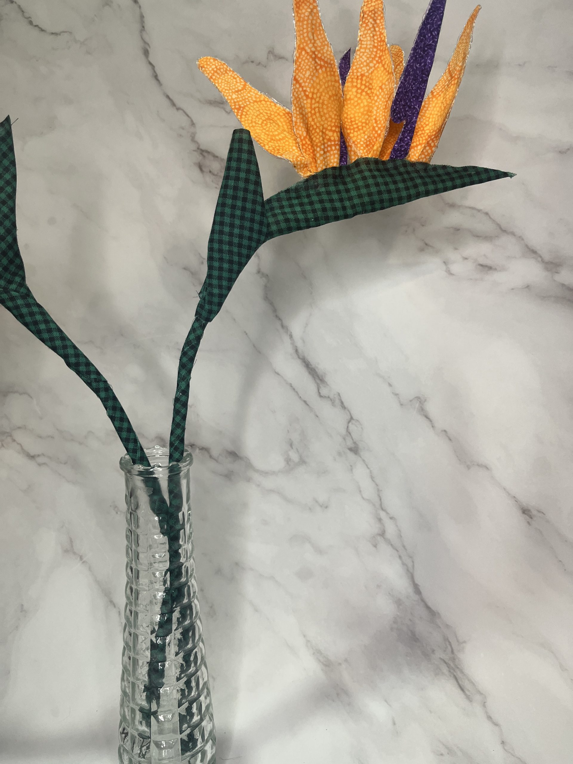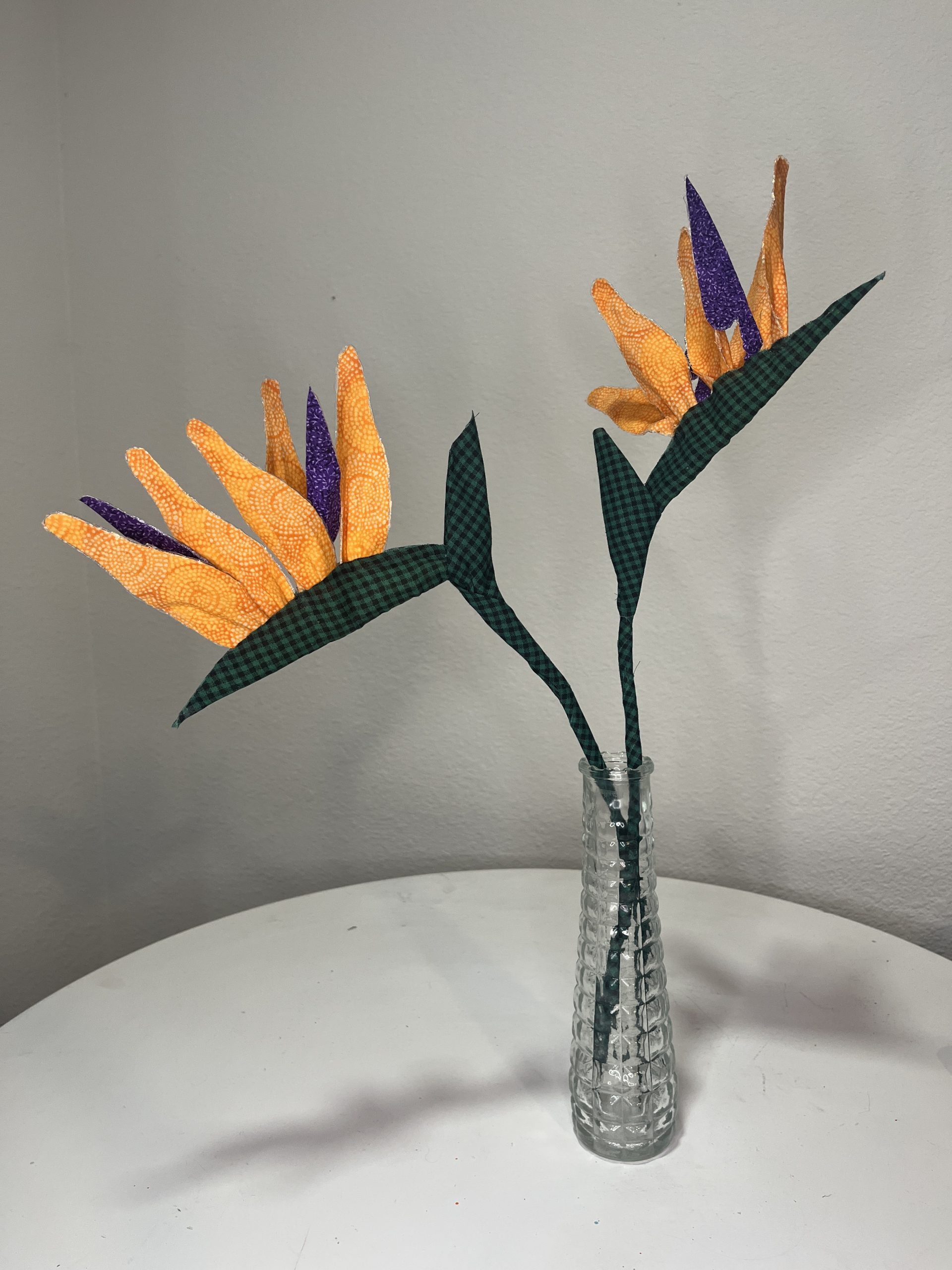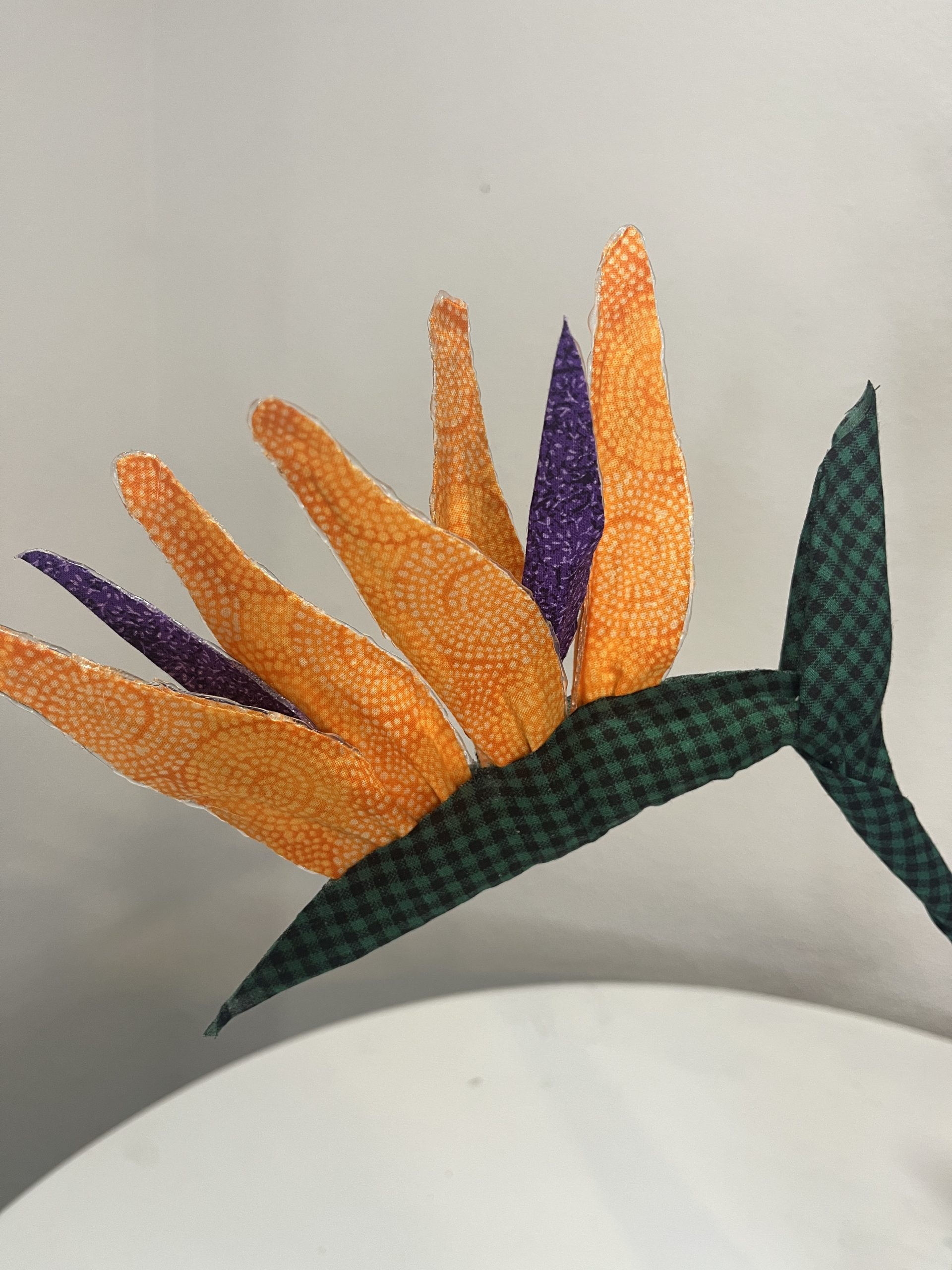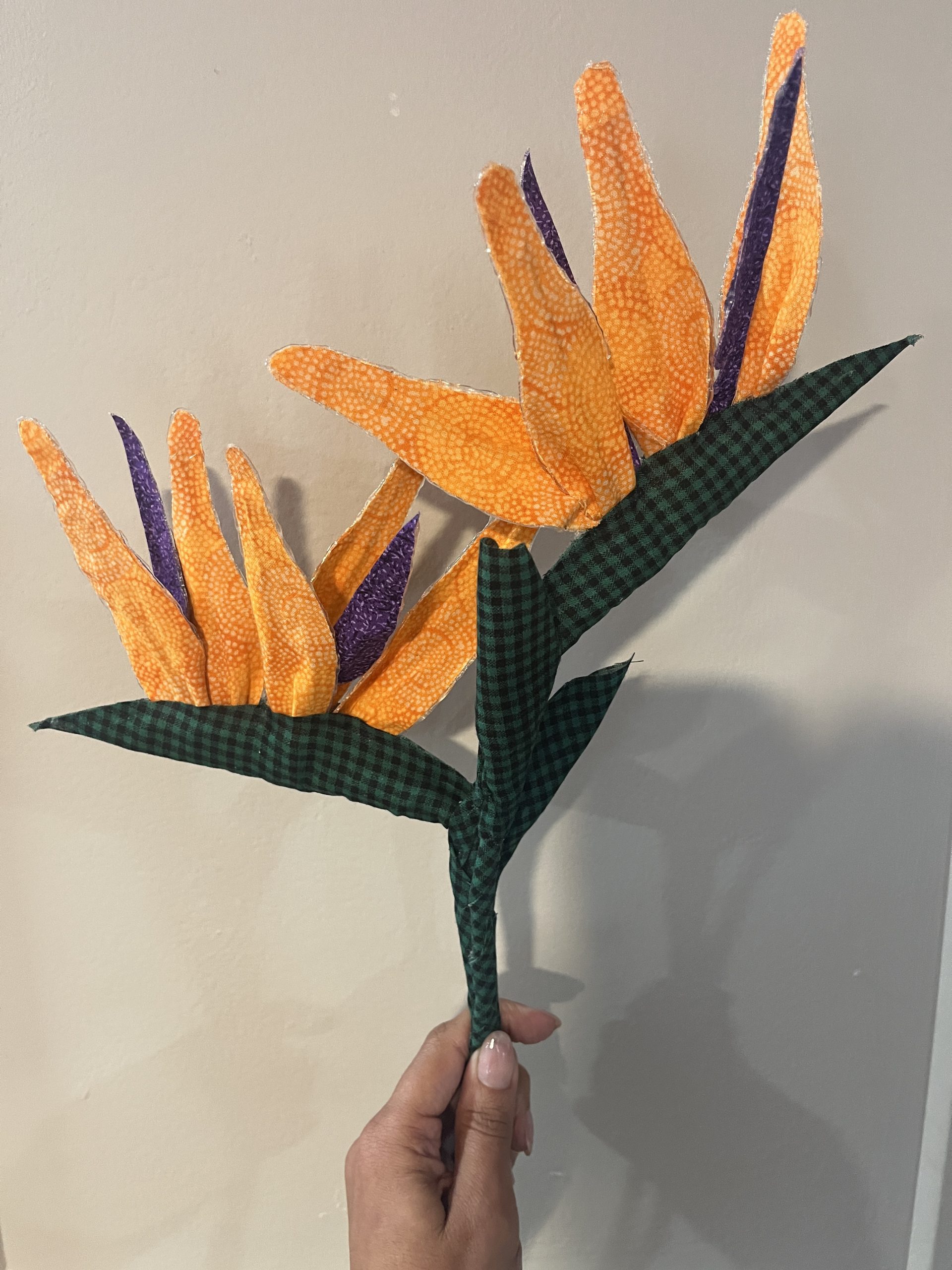 This Bird of Paradise flower is made of fabric. Price is per unit. It measures 6 inches wide and almost 16 inches tall. For customized order click here.