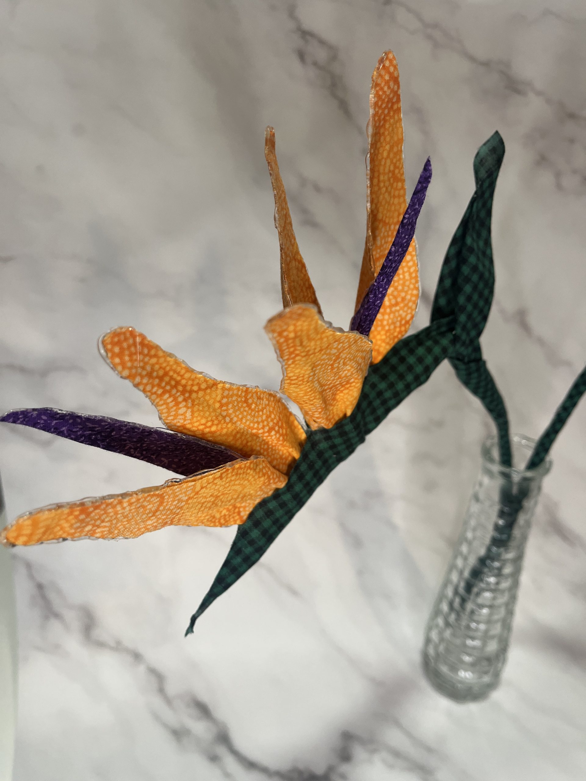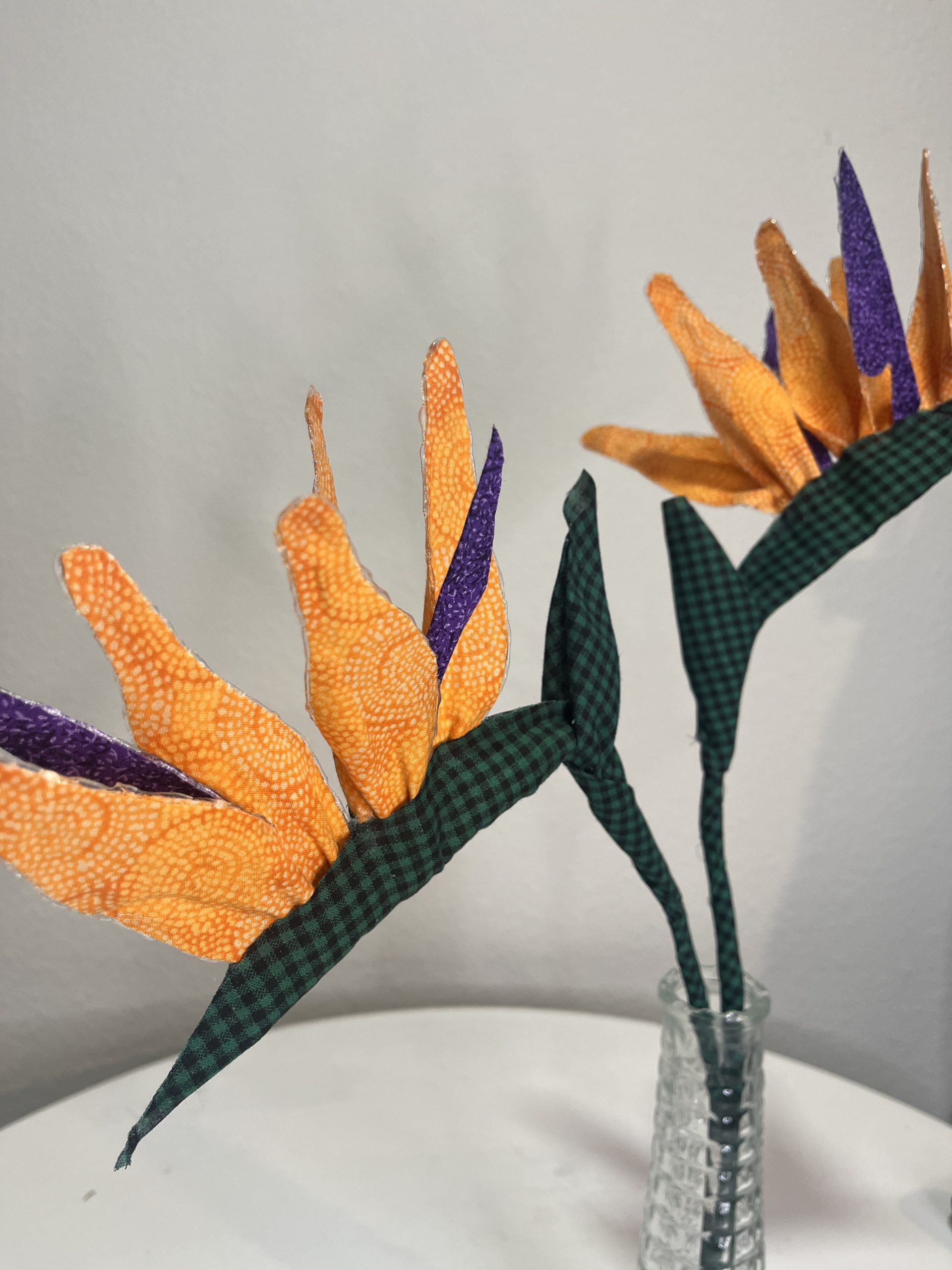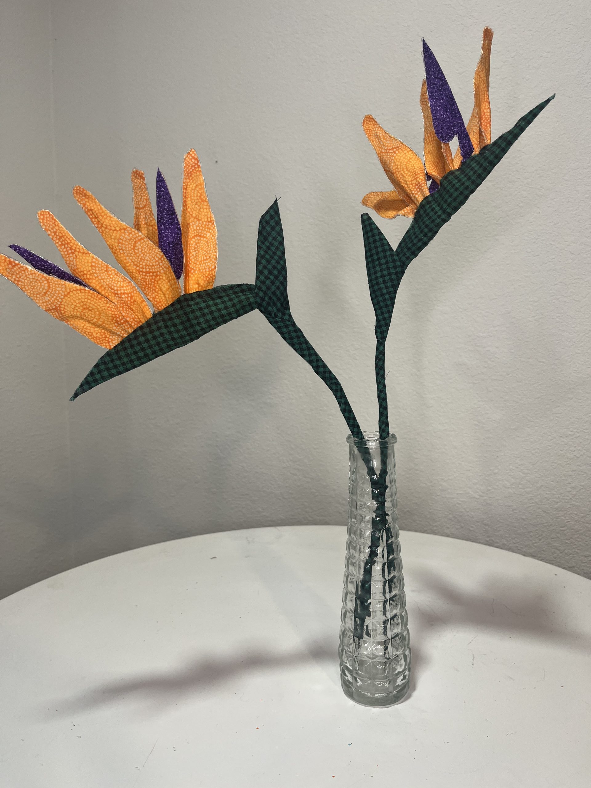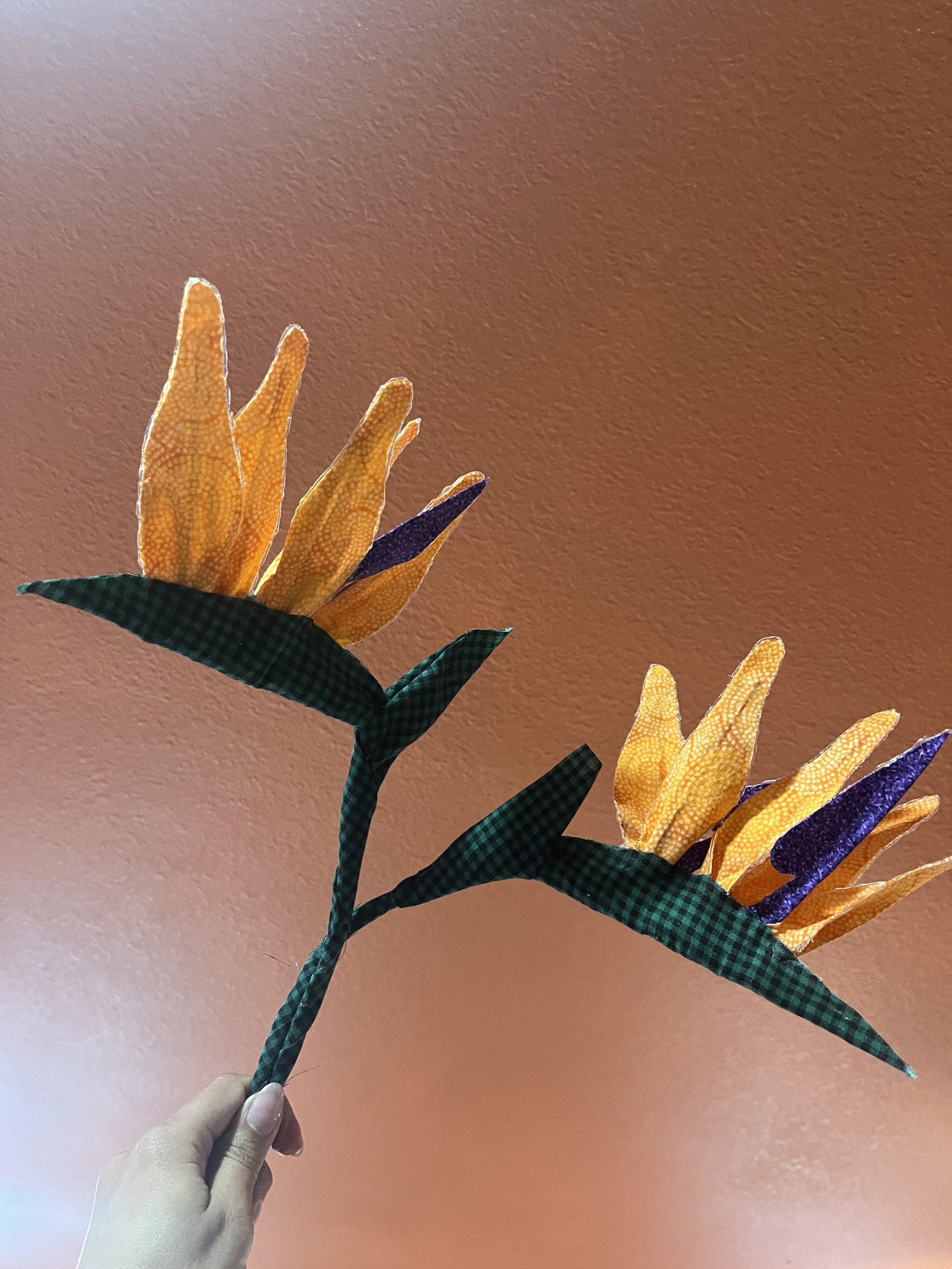 This Bird of Paradise flower is made of fabric. Price is per unit. It measures 6 inches wide and almost 16 inches tall. For customized order click here.