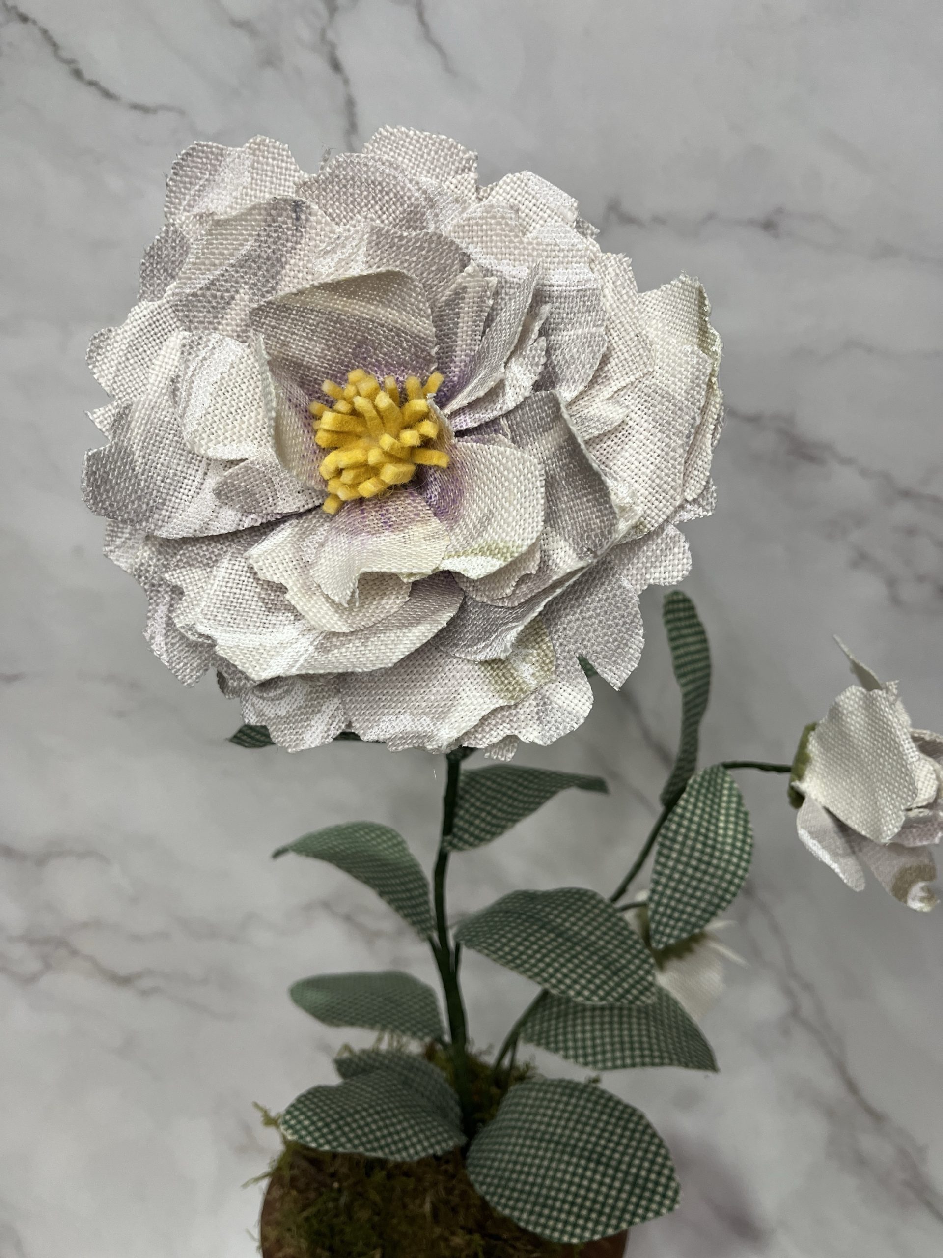 The Fabric Camellia is a quiet whisper of beauty — a piece born from patience, artistry, and a unique technique that transforms simple materials into poetry. Each petal, shaped from specialty 100% linen, is tenderly formed by hand, unfolding with the grace of a living bloom. Its slender stem rises gently, carrying handmade flowers that radiate timeless allure and subtle charm.