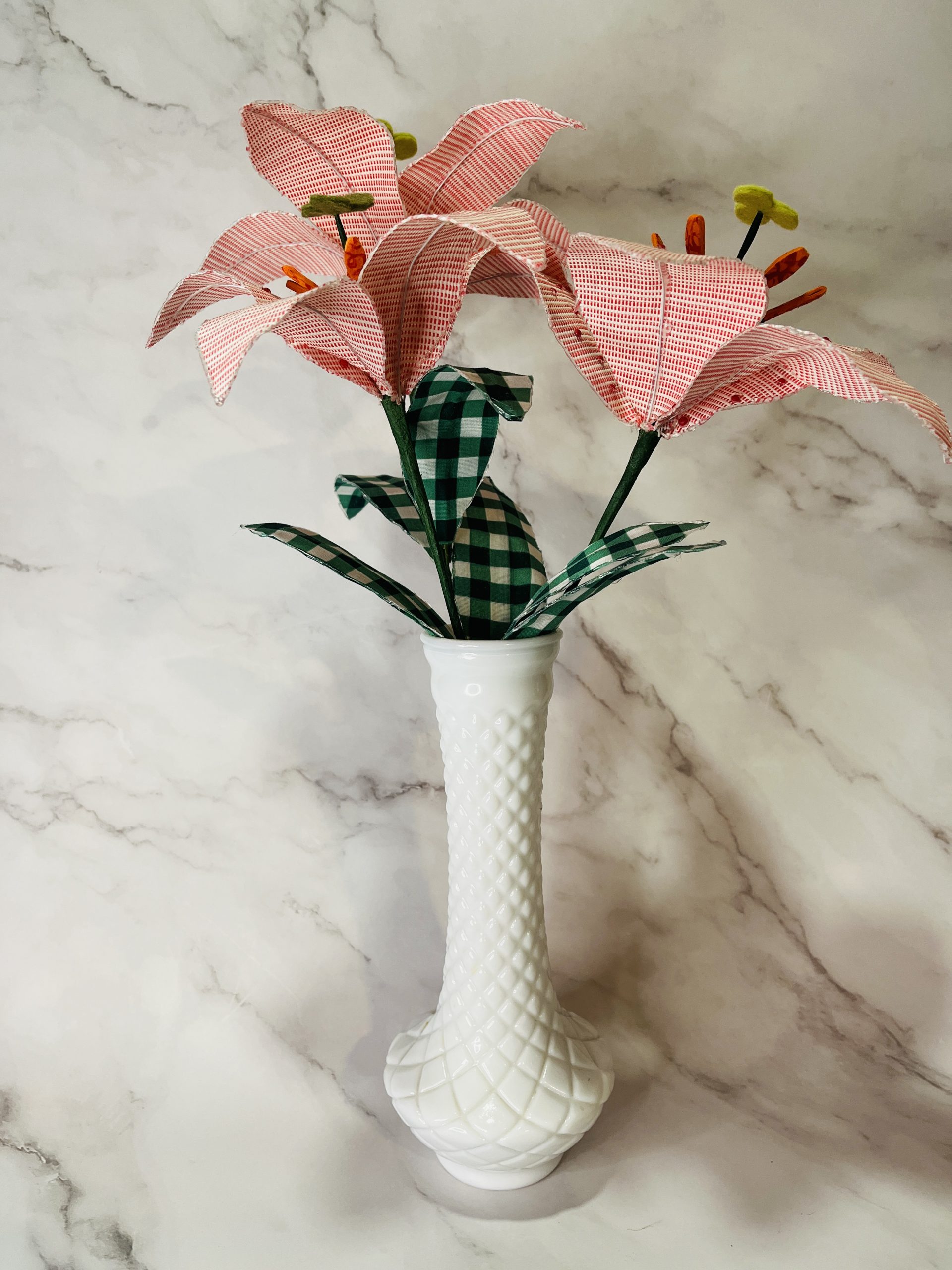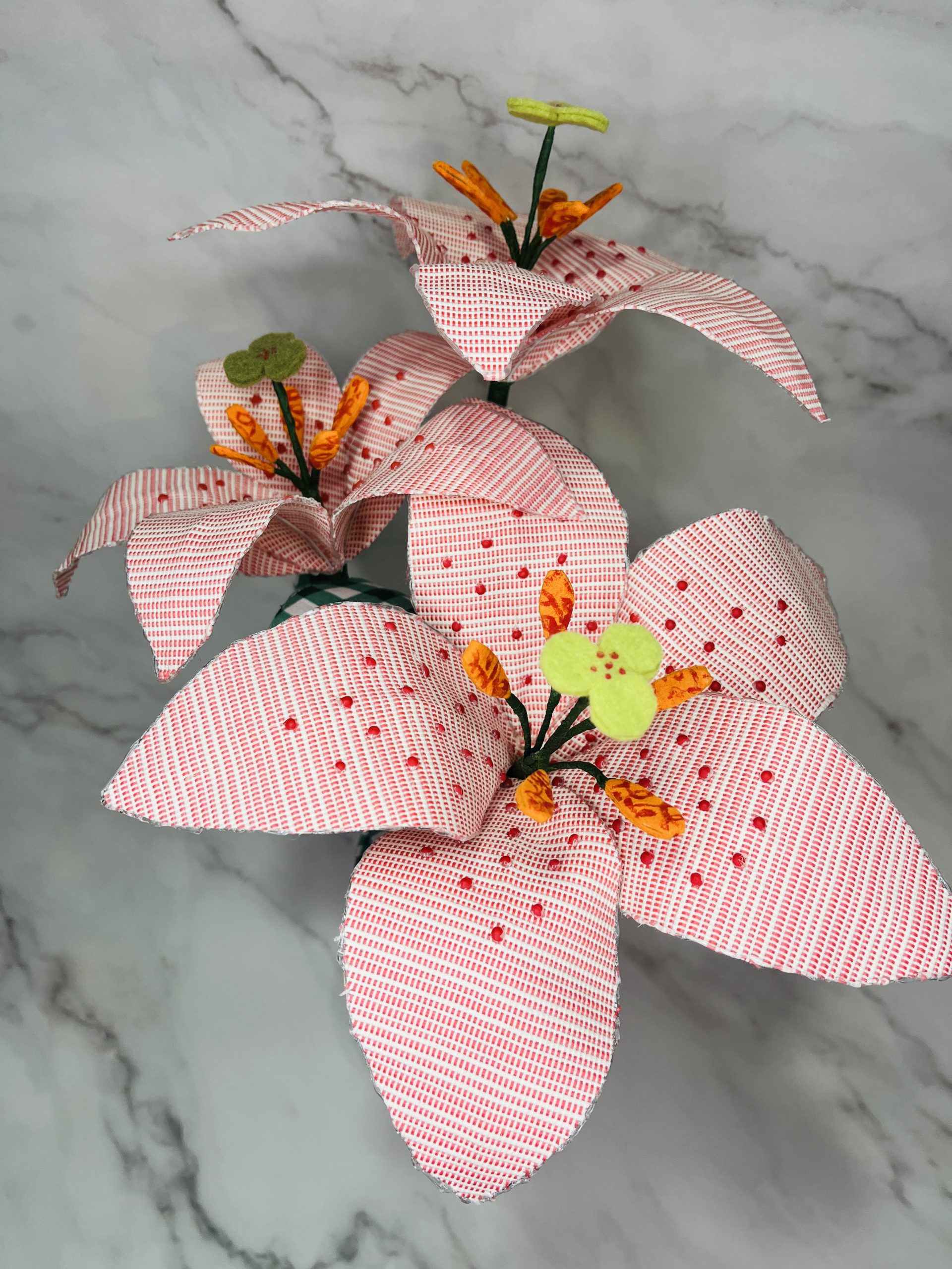 Measurements: 16″ approximately tall. The flower measures around 6″. Made out of fabric.