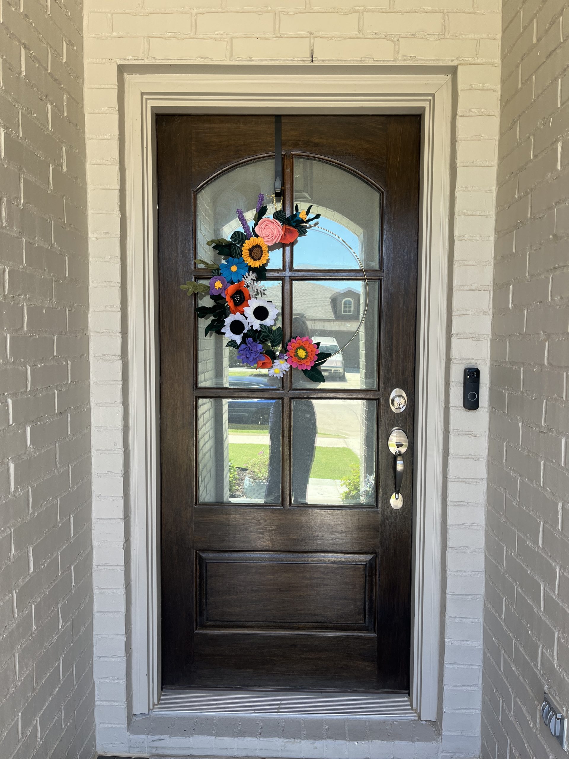 A wreath celebrating summer with vibrant flowers that stay in bloom throughout the season. This particular wreath includes nine types of flowers: zinnia, hydrangea, sunflower, poppy, lavender, daisy, lavender, and rose.