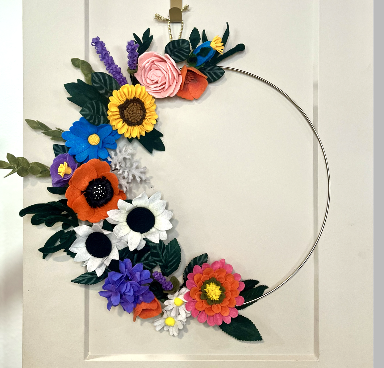 This particular wreath has a diameter approximately of 25 inches. Each flower measures between 2 – 6 inches wide. Made to order in a gold-colored metal ring.